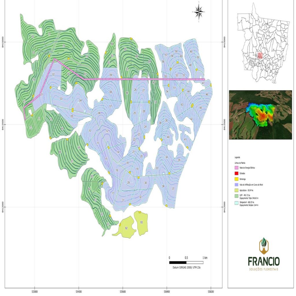 Os mapas e projetos de SIG são essenciais para a gestão florestal, permitindo o planejamento e a amostragem de solos, a análise do uso do solo e o talhonamento. Com geotecnologias, é possível mapear áreas produtivas, otimizar o manejo e melhorar a tomada de decisões, garantindo maior eficiência e sustentabilidade.